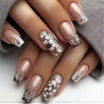 Luxury Floral Press on Nails Set Medium Square Gradient Nude Fake Nails for Women 24PCS