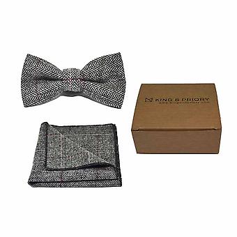 Stylish pewter grey bow tie and pocket sqaure in a premium, soft Herringbone fabric.Adjustable to a neck size of up to 21" with metal hook & eye fastening. Pocket square measures 25cm x 25cm.his set forms part of the King & Priory Vintage Collection.Matching waistcoat and tie are also available to complete and extend the look.Comes in King & Priory box, perfect to give as a gift.