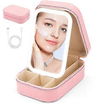 LED Travel Makeup Mirror with Adjustable Lights, Compact Cosmetic Case with 4 Compartments, Croc Pink