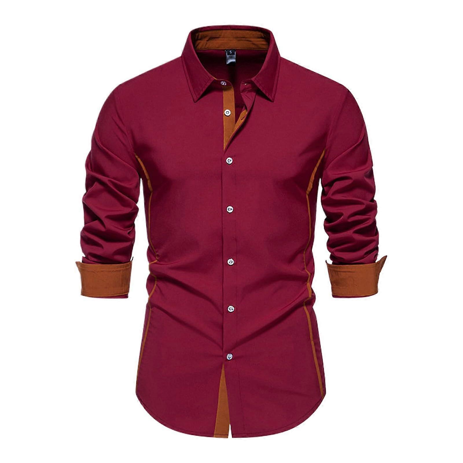 Men's Linen Shirt Stand-Up Collar With Pocket Cotton Regular Fit Button Placket Wine Red Size S