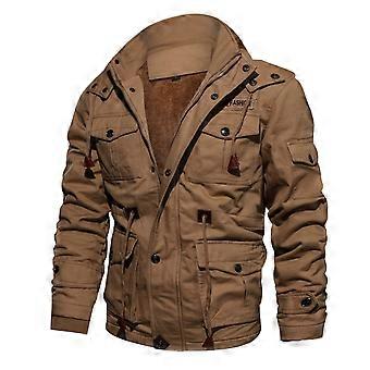 Men's Plus Velvet Thickened Midi Jacket with Zip, Extra Pockets, Softshell Work Jacket in Khaki, XXL Size for Outdoor Use