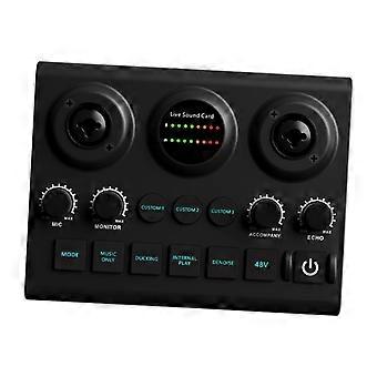 - Durable Construction : Crafted from high-quality material, this microphone sound card is designed for long-lasting performance, ensuring reliability for all your audio needs. - Compact and Portable : Measuring 15cm x 11.5cm x 4.8cm, this sound card is easy to carry, making it ideal for musicians, podcasters, and entertainers on the go. - Wide Compatibility : Compatible with both mobile phones and computers, this audio mixer features wireless connectivity, allowing for seamless integration and minimal audio delay during playback. - Vocal Removal Feature : Experience enhanced karaoke sessions with the vocal function that eliminates up to 99% of original vocals from your tracks, leaving you with only the instrumental accompaniment. Use Scenarios : 1. Karaoke Nights : Perfect for home gatherings, the vocal removal feature allows you to sing along to your favorite songs without original vocals, creating a true karaoke experience. 2. Podcasting and Streaming : Use the sound card for clear audio mixing during live streaming or podcast recording, ensuring your voice stands out without background noise. 3. Music Production : Ideal for musicians looking to create demos, this sound card provides a portable solution for recording and mixing audio tracks anywhere you go.
