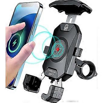 The motorcycle phone mount wireless charger output 15W max, USB C port output 20W max. This motorcycle phone charger mount supports charging two compatible devices at the same time. IP66 waterproof.The motorcycle phone holder USB C port can be connect to power bank or USB socket as power input port. At this time, the power switch does not work, you can charge cellphones through wireless charger only.The motorcycle cell phone mount adopts a convenient design. Put on or take out your phone with just one hand in 1s. 360 rotation design, adjust the angle freely according to your needs.Safe and sturdy: Adopts aluminum alloy handlebar ball mount, TPU over-molding ball joint, with anti-slip performance. Telescopic arm made of stainless steel, super sturdy. A special shape design of this motorcycle phone holder can be wrapping your mobile phone tightly Built-in with shockproof silicone. Keep your phone safe even when riding on bumpy roads.Wide compatibility: The universal motorcycle phone mount fit for 4'' - 7'' cellphones. Compatible with mobile phone thickness less than 16mm. The motorcycle phone holder handlebar mounting base fit for handlebars 0.87''(22mm) / 1.0''(25.4mm) / 1.26'' (32mm) in diameter. Can be installed on the handlebar or motorcycle mirror.