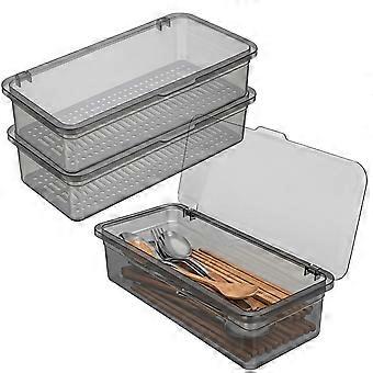 Cutlery Organizer with Dustproof Clear Lid, Stackable Utensil Storage Box with Draining Tray, 3Piece Set
