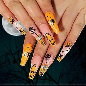 Halloween Press On Nails Coffin Long Fake Nails with Ghost Spider Web and Glitter Rhinestones 24pcs