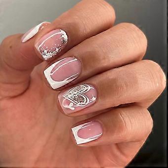 Valentine's Day Press On Nails Short French Tip Heart Design Acrylic Fake Nails 24pcs Reusable