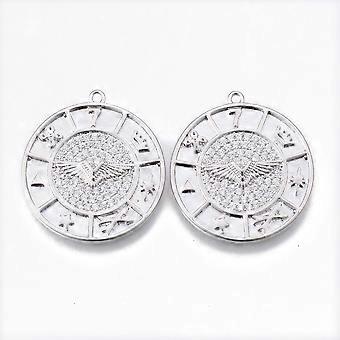 Brass Micro Pave Clear Cubic Zirconia Pendants Nickel Free Flat Round with Wings of Angel Platinum 25x23x2mm Hole: 1.2mm