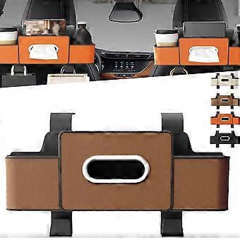 Leather Car Backseat Organizer with Cup Holders Hooks and Tissue Box, Waterproof Brown Storage