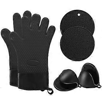 6pcs 500°F Heat Resistant Silicone Oven Mitts with Fingers, NonSlip Grip Gloves and Pot Holders Set for Kitchen Baking Cooking Black