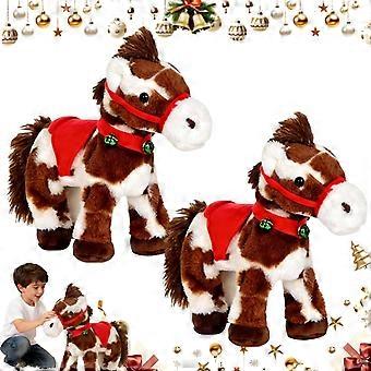 Electric Walking Plush Horse with Red Saddle and Green Bell, Animated Spotted Stuffed Animal