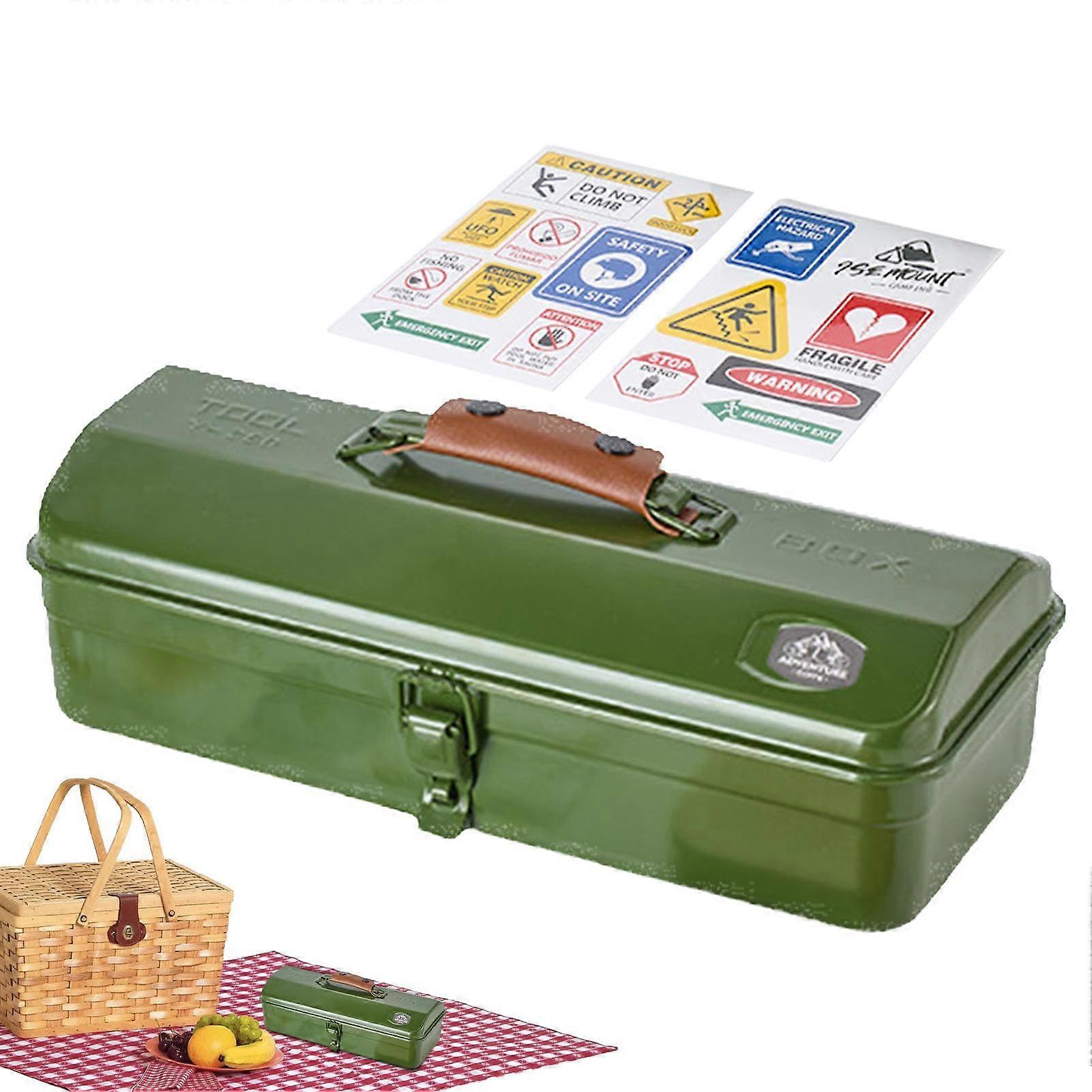 Portable Metal Tool Box for Camping Accessories, Handheld Outdoor Storage Case in Army Green with Stickers Iron