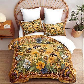 King Comforter Set Vintage Floral Yellow Blue Daisy with Flying Bee Design, All Season Oversized Bedding 3 Piece