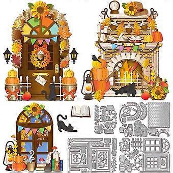 Fall Fireplace Cutting Dies Metal Autumn Window Door Die Cuts Pumpkin Leaves Cutting Embossing Templates for Scrapbooking Crafts Paper Thanksgiving Ca