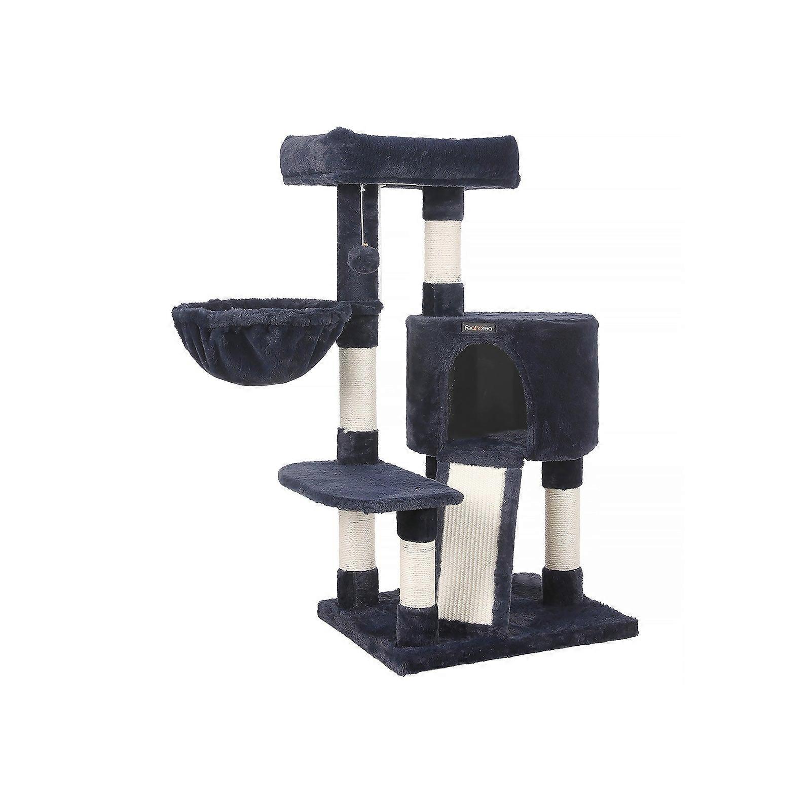 Krabpaal Homestorecity, krabpaal met zacht pluche, 104 cm, blauw - In de creatieve workshops van Homestorecity springen twee schattige kittens rond, inspecteren persoonlijk alle krabpalen en geven hun feedback. Zo kunnen de ontwerpers van Homestorecity zelf ervaren of hun producten voldoen aan de eisen van verwende snorharen. De hoogtepunten van deze krabpaal in één oogopslag: Duurzame en zachte pluche bekleding, pluisvrij; 1 krabplank om de klauwen te scherpen; 1 comfortabel, gezellig schuilplaatsje; 1 stabiel dutjebed; 1 doordacht uitkijkplatform voor observatie; 1 haarbal voor extra speelplezier. Productdetails: Kleur: blauw; Materiaal: spaanplaat, pluche, sisal; Afmetingen: 55 x 50 x 104 cm (L x B x H); Gewicht: 11,3 kg; Inhoud: 1 x Krabpaal; 1 x Anti-kantelvoorziening; 1 x Accessoirepakket; 1 x Gebruiksaanwijzing (DE, EN, FR, ES, IT) Homestorecity Opmerkingen: Als uw kat op de haarbal of het elastiekje kauwt, verwijder dan onmiddellijk het speeltje en bewaar het op een voor uw kat ontoegankelijke plaats. Als de kattenbak beschadigd raakt, repareer deze dan of vervang ze tijdig om verwondingen door beschadigde onderdelen te voorkomen.