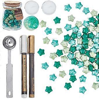 Sealing Wax Beads Kit Green Wax Seal Beads Set 3 Colors Star Shape Packed in Glass Jar with 2PCS Candles and Wax Melting Spoon Wax Stamp Pens for Wax