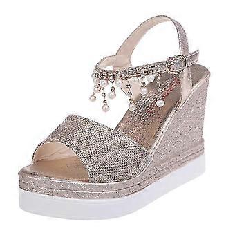 Women Wedge Sandals Platform Heels with Crystal Pearl Embellishments and Comfortable PU Slope Heel