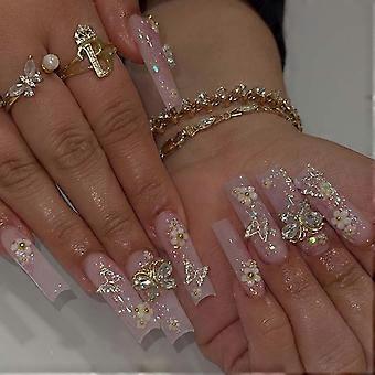 Butterfly Rhinestone Press on Nails Long Coffin White French Tip Fake Nails Glossy Acrylic 24PCS