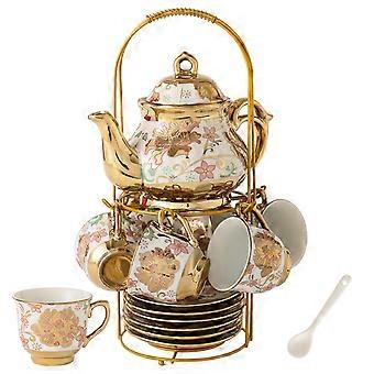 European Ceramic Tea Set with Tray, Porcelain Teapot and Cups, Embossed Gold Pattern for Living Room