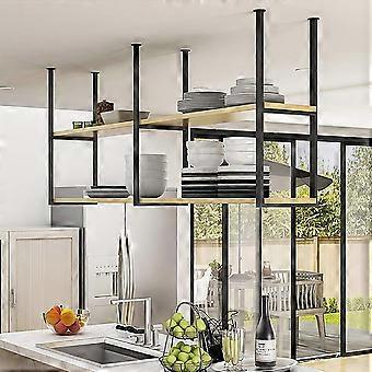 Ceiling Wine Glass Rack Metal and Wood Hanging Shelf with Integrated Glass Holders for Kitchen Bar