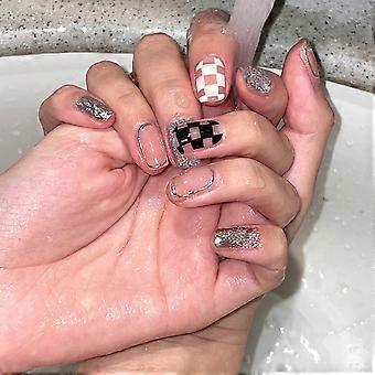 Short Glitter Press On Nails Pink and Black Checkerboard Fake Nails Kit Fast Application Salon Quality Acrylic False Nails