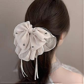 Large Beige Hair Claw Clip for Women with Beaded Bow, Secure Hold, Elegant Neutral Accessory