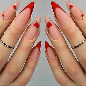 Valentine Press On Nails Medium Almond Matte French with Red Heart Design 24PCS Fake Nail Set