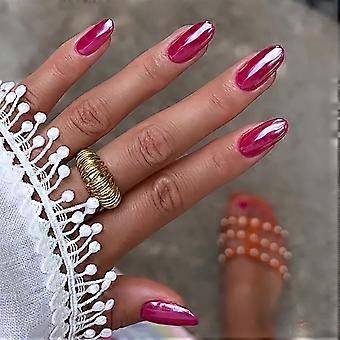 24 Pcs Rose Red Medium Almond Press On Nails with Glossy Laser Finish, Reusable Fake Nails