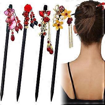 4 Pack Wooden Hair Sticks for Women, Japanese Hair Chopsticks with Tassel, Vintage Handmade Hairpins