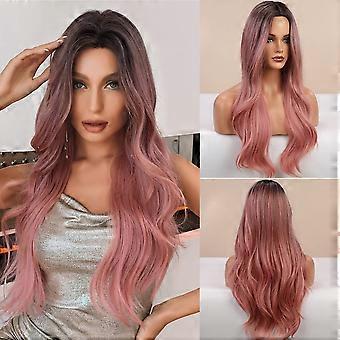 Long Wavy Wig with Bangs Ombre Pink Heat Resistant Synthetic Hair for Cosplay and Daily Wear