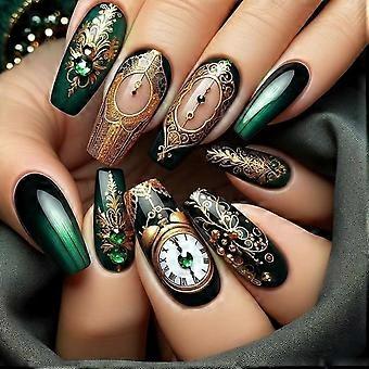 Green Shamrock Press On Nails Medium Coffin Fake Nails with Clock Design for St. Patrick's Day 24Pcs