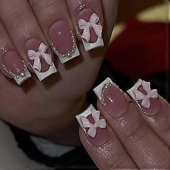 Short French Press on Nails Square Fake Nails with Pearl Bow, 24pcs Reusable Nail Tips for Women