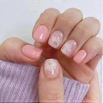 Extra Short Square Press On Nails Pink Glitter Fake Nails with White Flower Design for Women 24Pcs