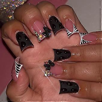 Black French Tip Press On Nails with Rhinestones, Zebra Stripes, Duck Shape Acrylic Fake Nails