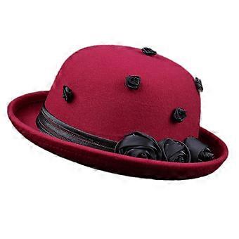 Winter Hat with Wide Brim for Women, Round Top Cotton Hat with Rose Flower, Lace Band for Wedding and Christmas, Red
