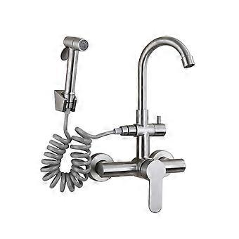 Stainless Steel Double Hole hot and Cold Mixing Faucet Wall Mounted Balcony Laundry Rotating Faucet with Spray Gun