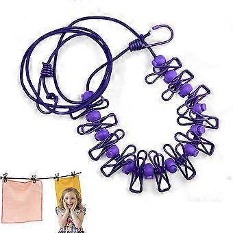 Travel Clothesline Windproof Retractable DualLock with Stainless Steel Hooks for Camping Purple