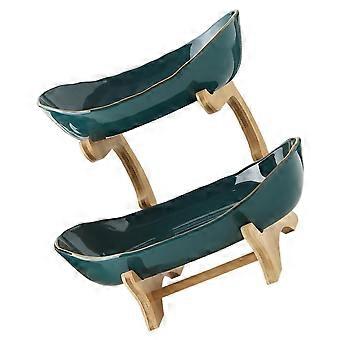 Double Layer Fruit Storage Stand with Wooden Base, Ceramic Serving Tray for Home and Parties