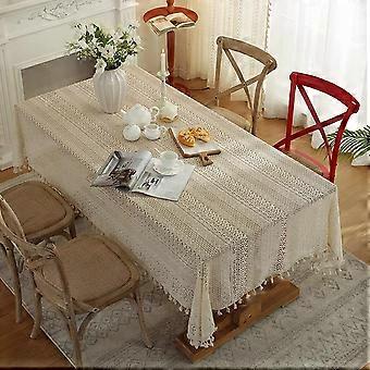 Tassel beige embroidered crochet hole tablecloth, party birthday dining cover table boho striped geometric tablecloth, rectangular 59 'x120'