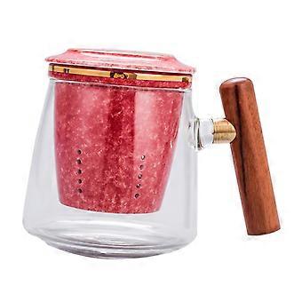 Glass Tea Mug with Infuser and Wooden Handle, Retro Design Coffee Cup for Office, Red 13.5x10.5cm