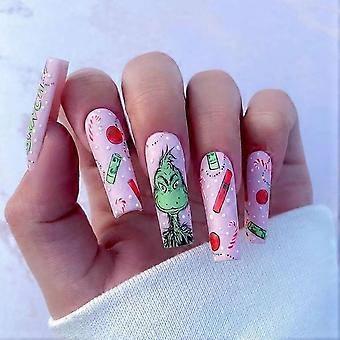Christmas Press On Nails Set Long Square Grinch Inspired Green Fur Monster False Nails with Candy Cane Design 24Pcs