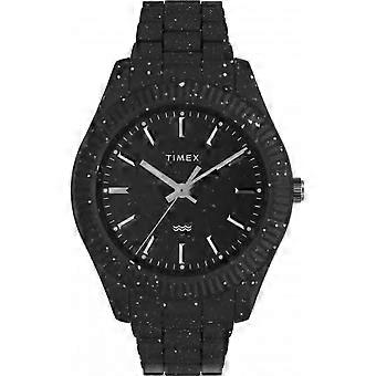 tide™, Timex ensures that each bracelet watch begins its journey from waste to wrist via ethical practices. Fishermen collect plastic waste from coastlines, leading to a meticulous process that transforms it into a stylish accessory. This circular economy model encourages consumers to take pride in their choice of luxury. The watch features a sleek black case, bracelet, and dial, all designed for a captivating look. Its marine-inspired dial showcases unique flakes of shredded material, making each watch a one-of-a-kind masterpiece. You can wear your commitment to sustainability without compromising on style. Durable and Water-Resistant: With a 30-meter water resistance rating, this watch stands ready for adventure, rain or shine. Elegant Design: The matte black finish and luminant hands deliver a sophisticated aesthetic, suitable for any occasion. The dimensions are perfectly tailored for a comfortable fit, with a full case size of 42 mm. The mineral glass crystal ensures durability while providing clarity. Timex assures the quality of its craftsmanship; thus, each timepiece is presented elegantly in Timex packaging, accompanied by a gift bag and certificate of authenticity. Celebrate style and sustainability with the Timex Legacy Ocean Recycled Plastic Bracelet Watch, where luxury meets responsibility.