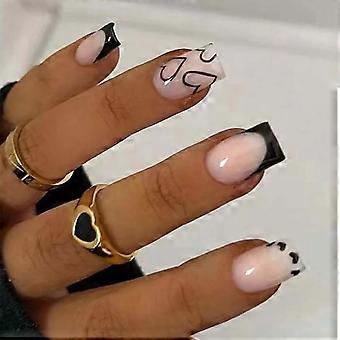 Press On Nails French Tip with Black Hearts Short Square False Nails for Women Valentine's Day 24Pcs