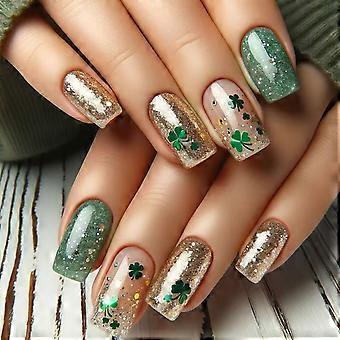 St. Patrick's Day Press On Nails Green Clover and Gold Glitter Fake Nails Medium Length 24pcs