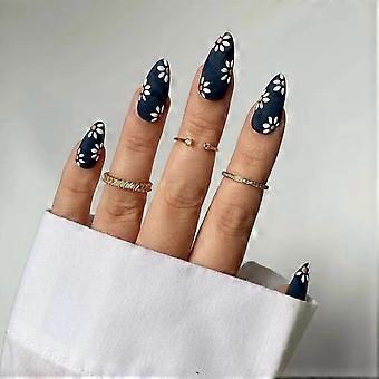 Almond Press On Nails Black Floral Glossy Daisy Tips Salon Quality Set with 24 Pieces and 12 Sizes