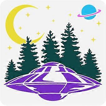 UFO Flies to The Moon Painting Stencil 11.8x11.8inch Spacecraft in The Forest Painting Stencil Reusable Plastic Hollow Out Stencil DIY Craft for Paint