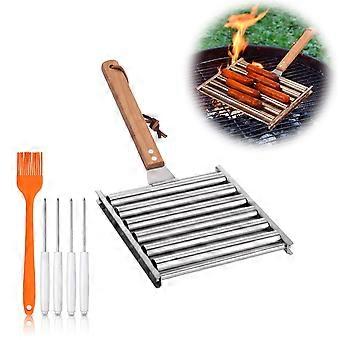 Stainless Steel Hot Dog Roller with Extra Long Wooden Handle and 4 Skewers for BBQ and Camping