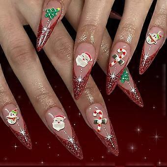 Christmas Press On Nails Long Stiletto Fake Nails Red French Tip Candy Cane Santa Glitter Holiday Set 24pcs