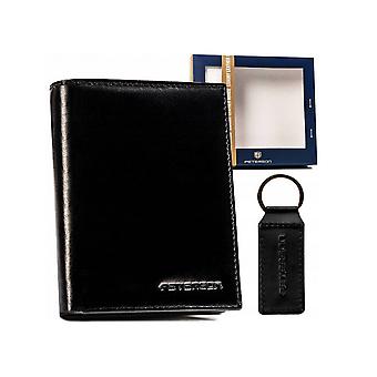 Gift Set: Men's Leather Wallet and Keychain - PetersonHigh quality| The wallet is made of natural leather;Classic style| Black wallet. The front is decorated with the brand's logo. Model in vertical orientation without external fastening;Capacious, with a number of compartments| The wallet will be perfect for you if you carry large-format documents on a daily basis, such as a registration certificate. Moreover, you can fit large amounts of cards and cash in it. The model holds a registration certificate;Protection of your cards and documents | Equipped with the RFID BLOCKING SYSTEM technology, which protects proximity cards, biometric documents, ID cards and public transport cards against unauthorized reading of data.Complete with a stylish key chain.DimensionsHeight12.5 cmWidth10 cmThickness2.5 cmSet with leather keychainAn elegant logoed keychain that will be a great complement to your keys, offering not only a visual aspect, but also an additional sense of security. Keys attached to a key ring are always less likely to be lost.Interior - spacious and functionalThe wallet is extremely functional. The interior has been designed so that you can fit all the most important things in it. Intuitive arrangement of compartments and pockets ensures comfort of use.The wallet includes:10compartmentsdedicated to cards, business cards or documents;6 document pockets in a larger format, like a registration certificate in a cover from the communication department;1 zippered compartment embroidered in the central part of the wallet.Section for coins and space for banknotesThere is 1 pocket in the wallet where you can hide coins. The pocket is quite roomy and fastened with a zipper.Almost the entire length of the wallet there are 2 deep and wide pockets for paper money.Additional back pocketThe pocket at the back of the wallet is very convenient. You can fit the card you use most often or it can be used as a place for single-use public transport tickets.