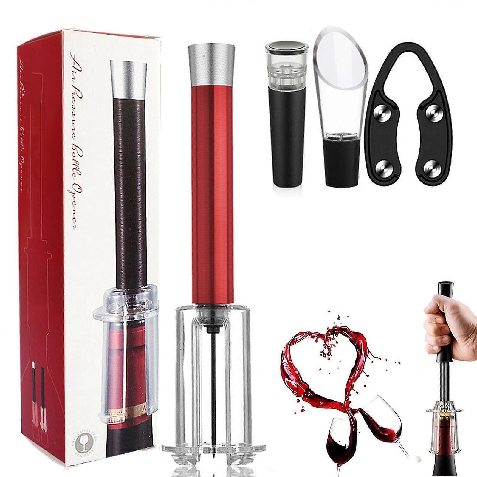 - 4-Piece Corkscrew Set: This comprehensive wine accessory kit includes a pneumatic wine corkscrew, wine pourer, vacuum stopper, and foil cutter, all crafted from durable stainless steel for long-lasting performance. - Air Pressure Wine Opener: The innovative air pressure design allows for effortless and quick bottle opening using natural pressure. Say goodbye to traditional corkscrew struggles and enjoy a seamless wine experience. - Efficient Foil Cutter: Easily remove aluminum foil seals with the foil cutter. Simply position it over the bottle cap and twist to remove the sealing film, ensuring a clean and hassle-free opening process. - Convenient Wine Pourer: The wine pourer fits securely into the bottle, allowing for smooth and controlled pouring. This feature minimizes spills, making it ideal for serving at gatherings or intimate dinners. Use Cases: 1. Perfect for home entertaining: Impress your guests with quick bottle openings and elegant pouring at your next dinner party. 2. Ideal for wine lovers: Enhance your wine tasting experience with this complete set, making it easier to enjoy your favorite vintages without fuss. 3. Great for gifts: This stylish set is an excellent gift for weddings, housewarmings, or holidays, appealing to both casual drinkers and connoisseurs. Each tool in this set is designed for effortless use and compatibility with most wine bottles, ensuring you can enjoy your favorite wines with ease and elegance.