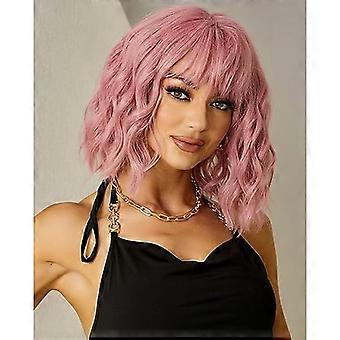 Light Pink Short Wavy Human Hair Bob Wig with Bangs for Women, Heat Resistant and Tangle